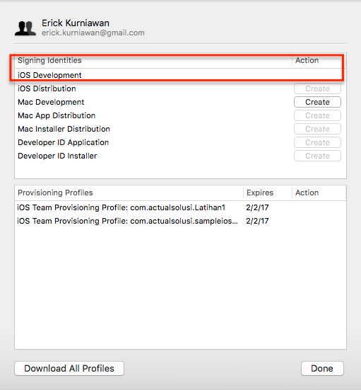5. Akan ditampilkan pilihan Signing Identities, pilih iOS Development, dan pilih tombol Create.