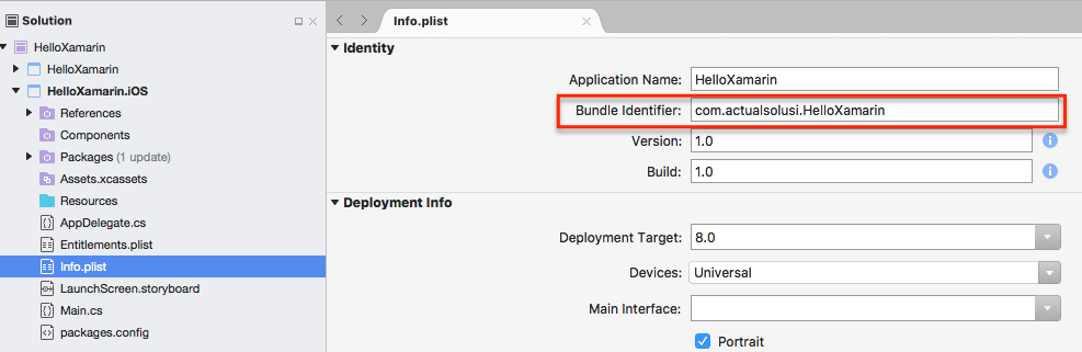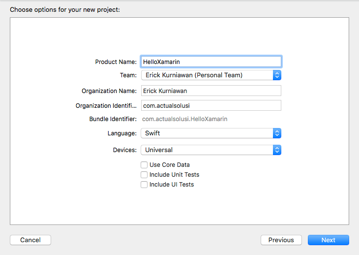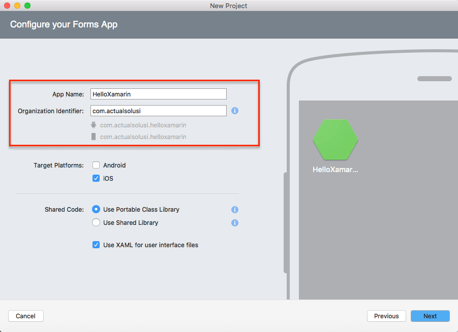 7. Tambahkan informasi nama project dan organization identifier. Pemberian nama ini akan menentukan nama namespacenya. Misal pada contoh dibawah ini nama namespacenya adalah com.actualsolusi.HelloXamarin.