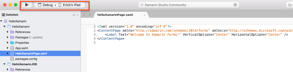 6. Untuk mencoba menjalankan aplikasi pada device, pilih target device (pada contoh berikut adalah Erick’s iPad). Kemudian tekan tombol Run untuk menjalankan aplikasi Xamarin Forms pada device.